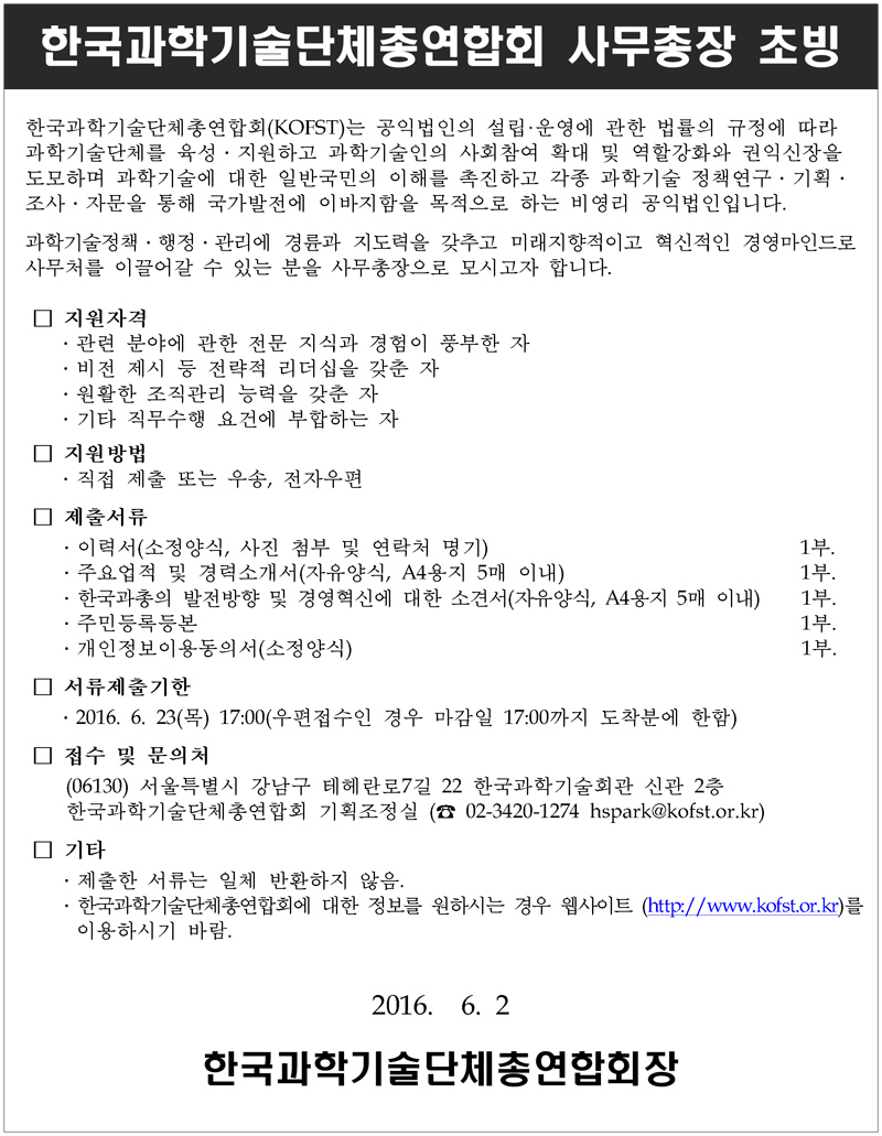 한국과학기술단체총연합회 사무총장 초빙 공고